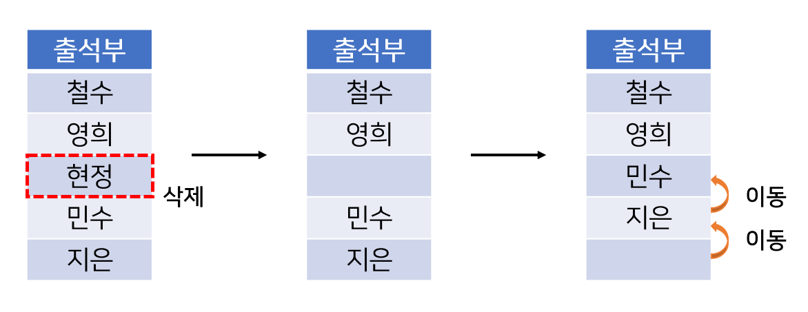 순차 리스트는 데이터를 삽입하거나 삭제하고 나면, 연속적인 물리적 위치를 유지하기 위해 원소를 옮기는 추가 작업을 해야 합니다.