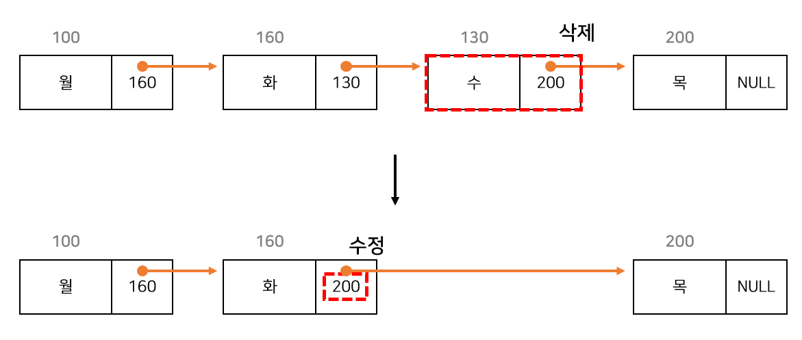 연결 리스트의 삭제 과정 두 그림을 비교해 보면 순차 리스트는 데이터의 삭제 작업이 이루어진 뒤 원래 데이터가 담겨있던 주소에 변화가 생겼지만, 연결 리스트는 주소가 변경된 노드가 없습니다.