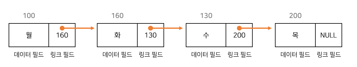 노드는 실제 데이터가 저장되는 공간인 데이터 필드와 다음 노드의 주소 값을 가진 링크 필드로 이루어져 있습니다.