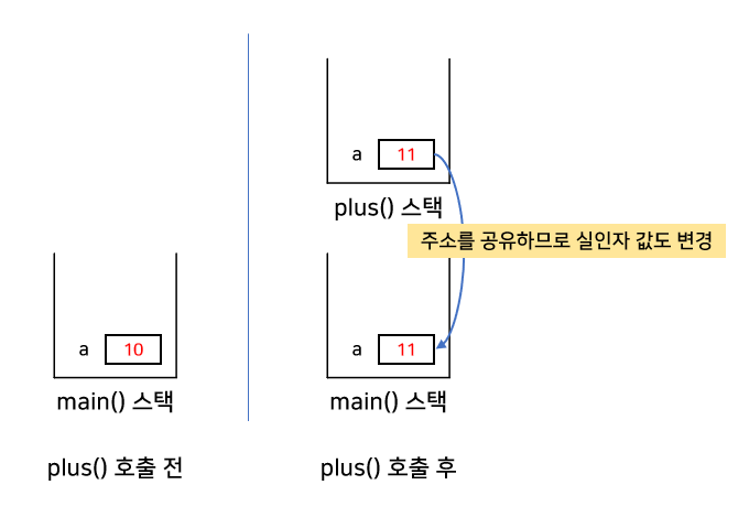 void plus(int a) { a++; // 새로운 변수 a에 ++연산 } int main() { int a = 10; plus(a); // 함수 호출 return 0; }다음과 같이 함수 plus에 매개변수로 int a를 전달하면, 함수 plus는 새로운 변수 공간을 만들어 전달받은 값 10을 복사합니다.