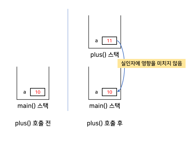 plus 함수에서 새로운 변수를 생성했기 때문에 main 함수의 a와 plus 함수의 a는 값만 같을 뿐, 다른 변수입니다.