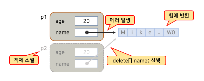 class Person { int age; char *name; public: Person(int age, char *name) { // 생성자 this->age = age; this->name = new char [10]; // 동적 메모리 할당 strcpy(this->name, name); } ~Person() { // 소멸자 delete[] name; // 동적 할당된 메모리 해제 } }; int main() { Person p1(20, "Mike"); Person p2(p1); }Person 클래스의 멤버에 포인터 변수 name을 추가하고 문자열 공간을 동적으로 할당했습니다.