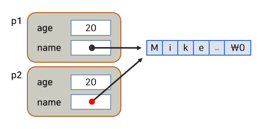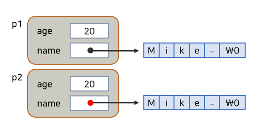 Person(Person& p) { this->age = p.age; this->name = p.name; // 메모리 주소값(포인터) 그대로 복사 }얕은 복사로 모든 멤버를 복사하게 되면, p1.name의 메모리 주소가 p2.name에 그대로 복사되면서 둘은 같은 메모리 공간을 공유합니다.